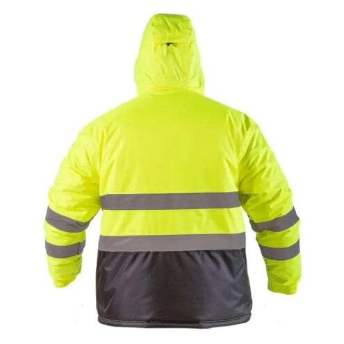 Diseñada para entornos laborales exigentes, esta parka combina alta visibilidad, impermeabilidad y protección térmica. Fabricada con una membrana de dos capas, ofrece excelente impermeabilidad y respirabilidad, manteniendo al usuario seco y cómodo al evitar la entrada de agua y facilitar la expulsión del calor corporal.