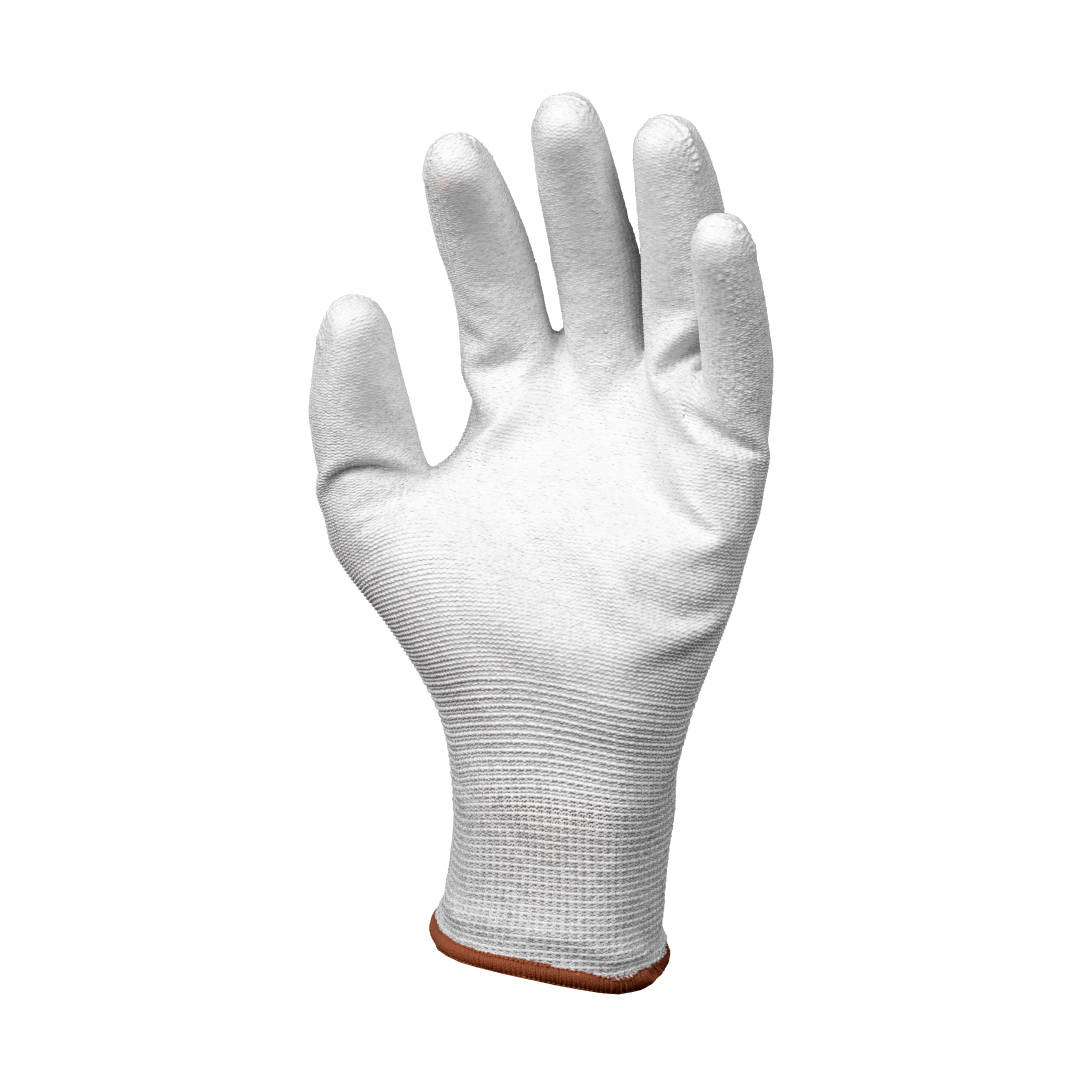 Su recubrimiento de poliuretano (PU) blanco en la palma mejora el agarre y la resistencia al desgaste, mientras que su tejido es compatible con dispositivos de pantalla táctil, lo que permite trabajar con tecnología sin quitarse el guante.