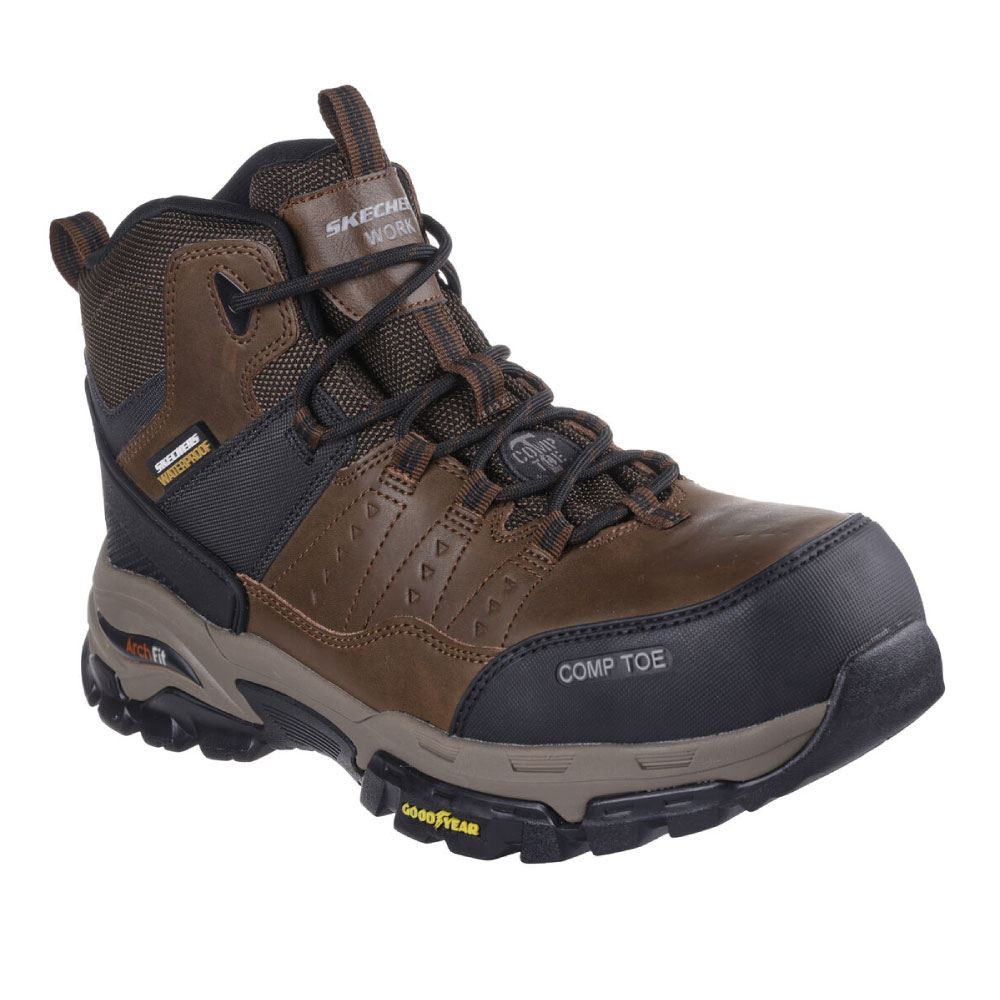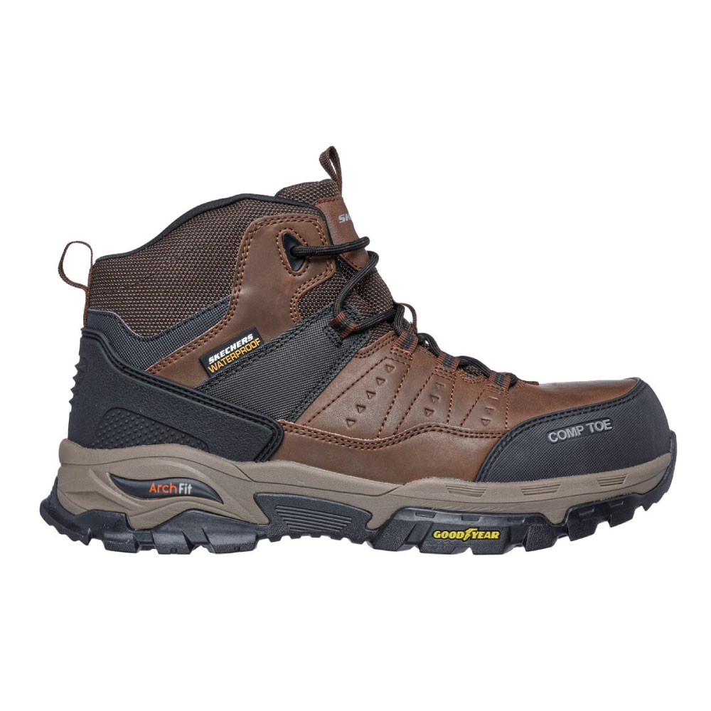 Este bototo top de línea, es impermeable y está confeccionado con una capellada mixta de cuero, microfibra sintética y malla con cordones. Además, presenta una puntera de composite ultraligera, una plantilla Arch Fit® removible y una suela de goma de máxima resistencia al deslizamiento Goodyear®.